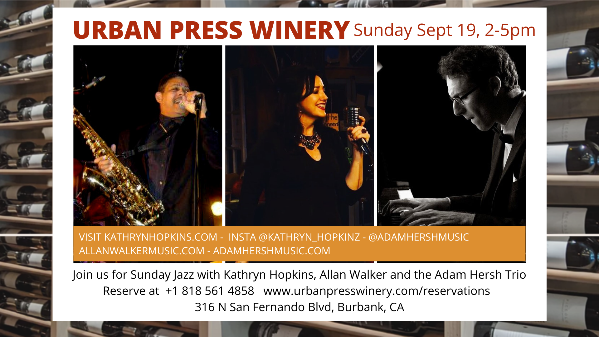 Urban Press Winery 316 N San Fernando Blvd, Burbank, CAKathryn Hopkins on vocals, featuring Allan Walker on tenor sax and the Adam Hersh trio.